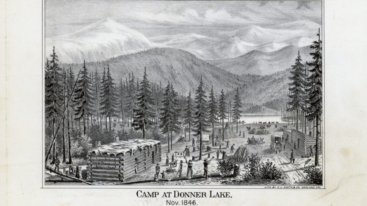The first rescuers from Sutters Fort reach the surviving remnants of the Donner emigrant party at their snowbound camp in the high Sierra Nevada Mountai...