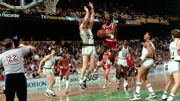 On April 20 1986 the Chicago Bulls Michael Jordan scores 63 points in an NBA playoff game against the Boston Celtics setting a post-season scoring re...